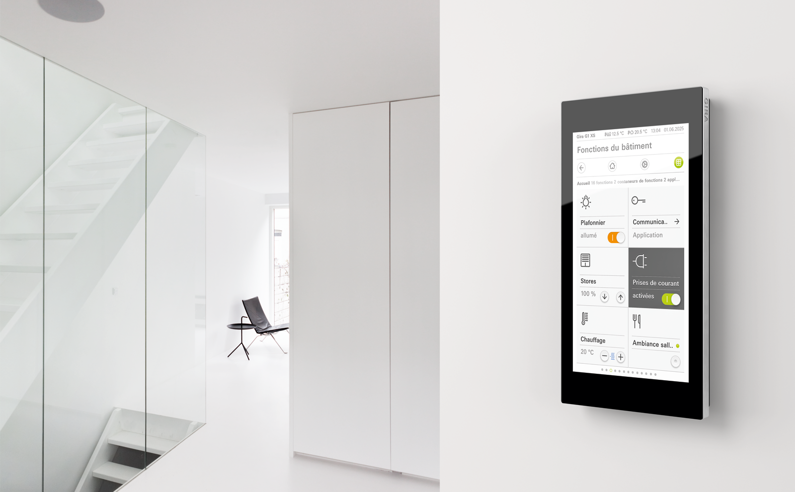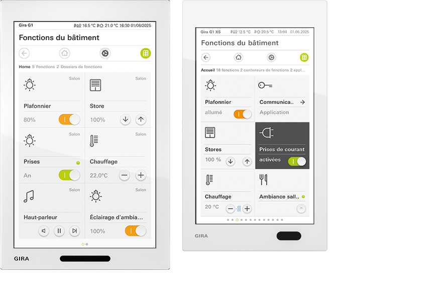 Le Gira G1 est idéal pour les projets exigeants en matière de visualisation, de personnalisation et de multifonctionnalité. Le Gira G1 XS est recommandé pour les constructions neuves ou les rénovations axées sur une commande Smart Home simple et économique, sans compromis sur le design, la sécurité ou le confort d’utilisation.