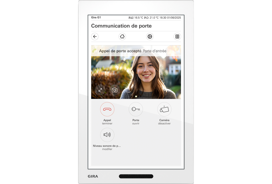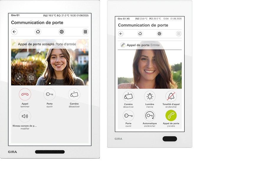La Gira G1 est la solution haut de gamme avec un écran 7 pouces, plus de capteurs, une compatibilité avec le HomeServer et davantage d’options de visualisation. Le Gira G1 XS est plus compact, doté d’un écran 6 pouces, et se concentre sur les fonctions essentielles du Smart Home : idéal pour les projets pour lesquels les coûts doivent être optimisés. Les deux prennent en charge Gira One, Gira X1, KNX Secure et la communication de porte via DCS ou SIP.