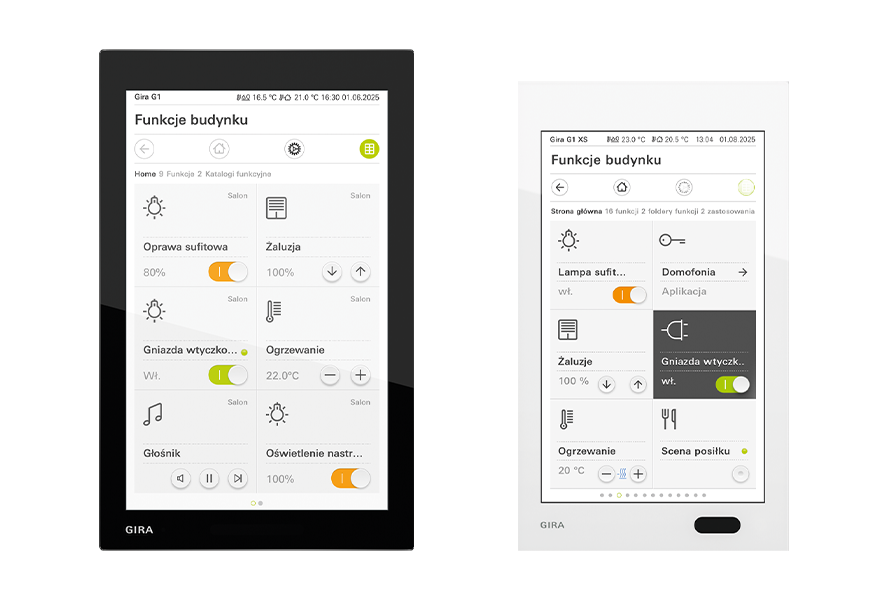 Dwa zaawansowane wyświetlacze wielodotykowe do systemu Gira One: Gira G1 z szerokim zakresem funkcji i oraz kompaktowy Gira G1 XS sterują oświetleniem, zacienieniem, klimatyzacją, scenami, domofonią i nie tylko – wszystko intuicyjnie za pomocą dotyku i gestów.